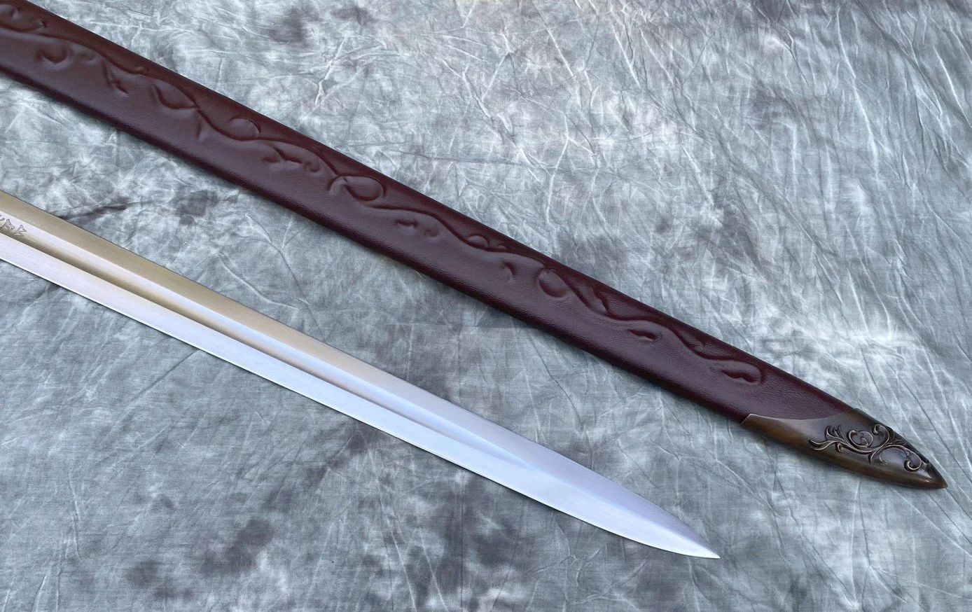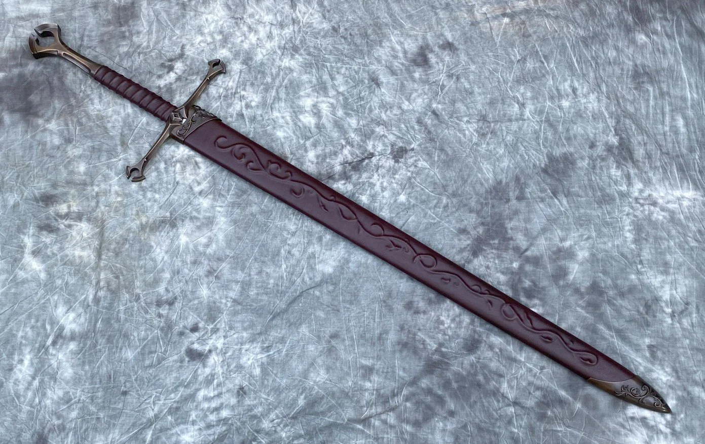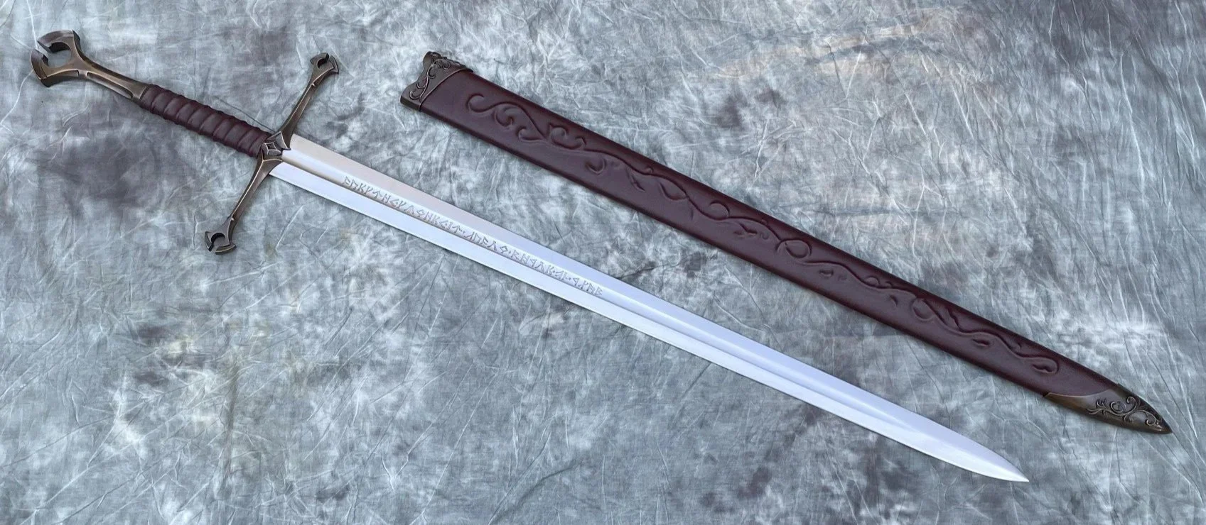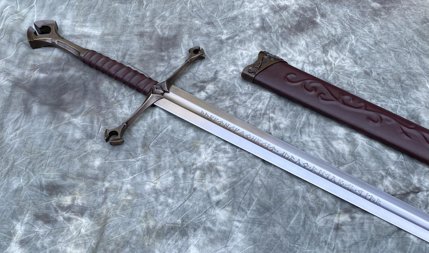 This Sword is loosely based on the Anduril movie sword. The blade is hardened and tempered 80CrV2 high carbon steel with a sharpened edge. The guard and pommel are sculptural quality silicon bronze. The tang extends all the way through the keyed slot in the pommel and is hot peened. The grip is a wood core with a linen cord wrap, a cotton cord riser, and a leather overwrap.