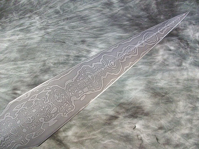 This pattern welded shortsword was commissioned as a wedding gift. The blade is multiple layers of 15n20/1084/80CrV2 steel which has been hardened and double tempered. The hilt and scabbard fittings are sculptural quality silicon bronze. The guard has been banzaipeened to the shoulder of the tang and the pommel is hot peened to the tang. The scabbard is leather covered wood with bronze chape, locket, and belt fittings.