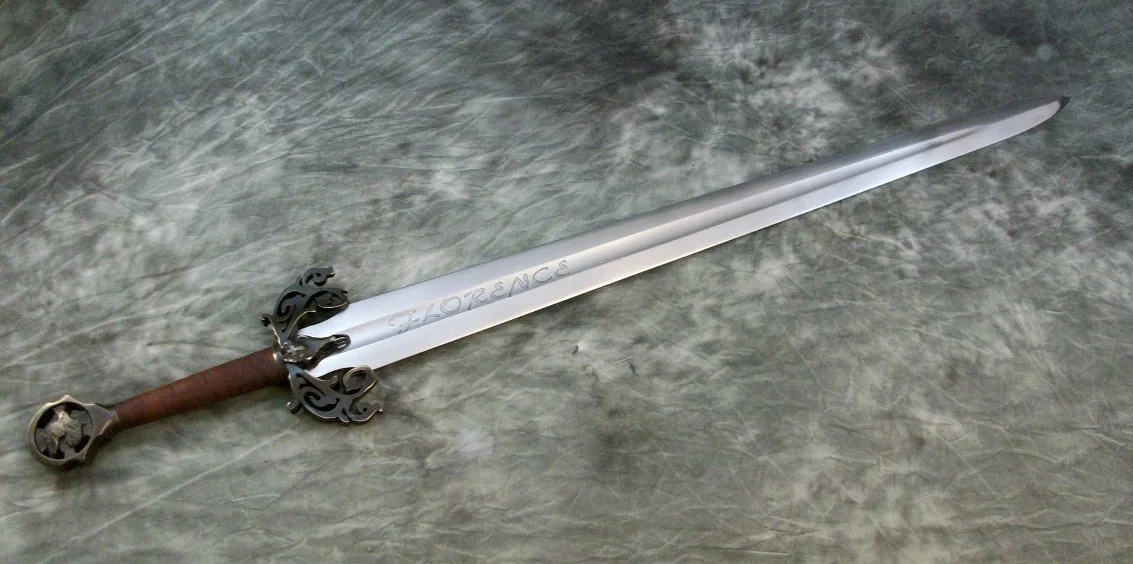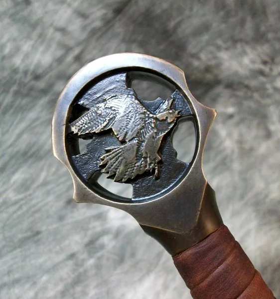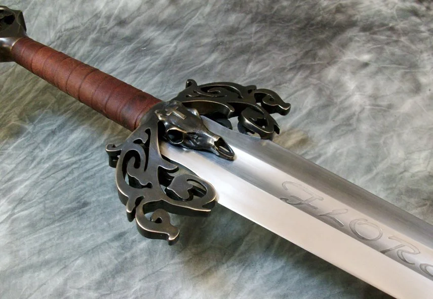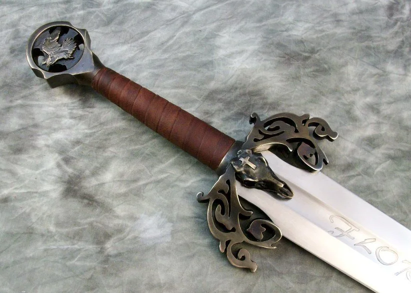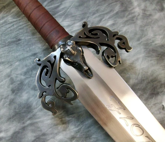 This Sword was a custom commission. The blade is hardened and double tempered 80CrV2 steel. The guard and pommel are sculptural quality silicon bronze. The pommel is hot peened to the tang and the guard is banzaipeened to the shoulder. The grip has a wood core with a spiral leather covering.
