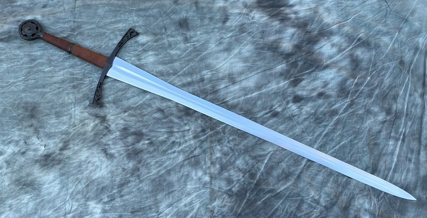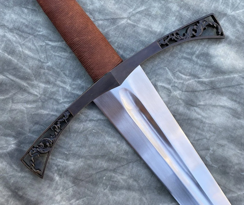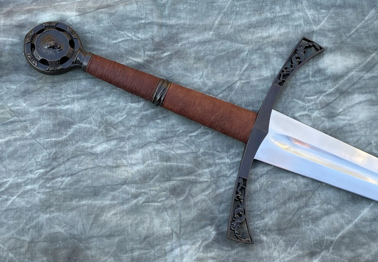 This sword started its life as a rusty blade blank from the Albion Swords moat sale many years ago. I finished the grinding on the blade and reshaped the tip, then heat treated the blank and did the normal finish grinding, sanding, and sharpening. A set of wax hilt components was fit to the blade and then cast in bronze. Finally adding a wood grip core with linen cord wrap and leather overwrap and the derelict blade is now a completed sword.