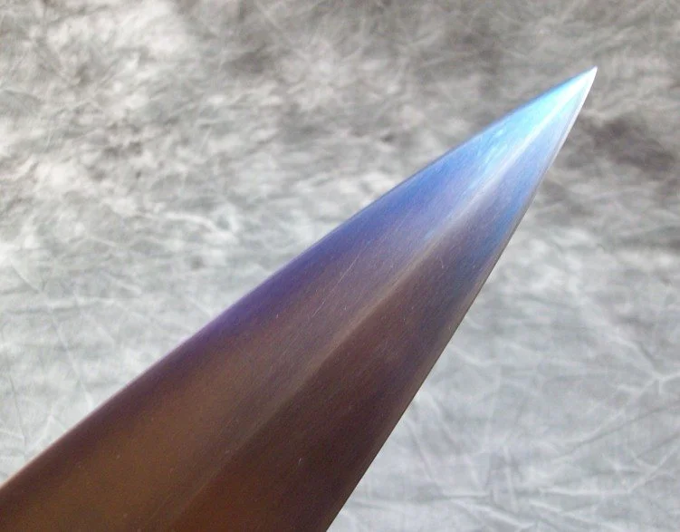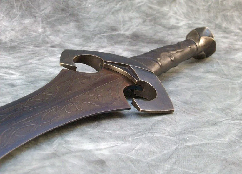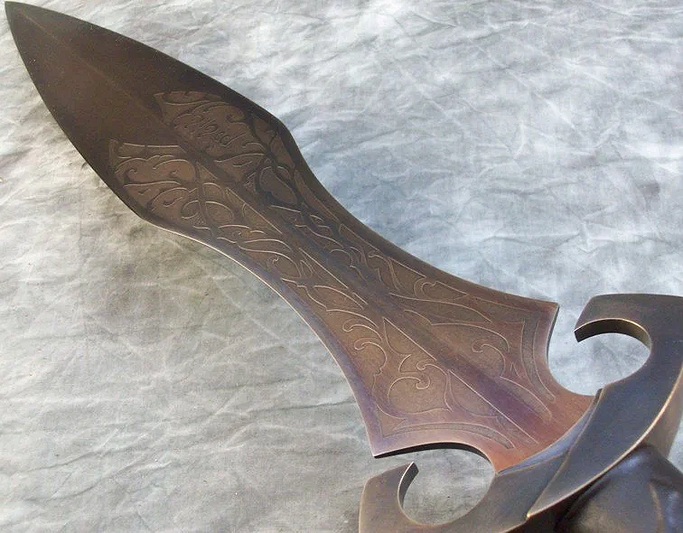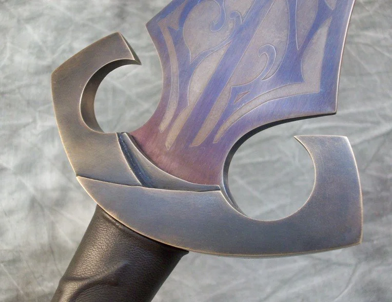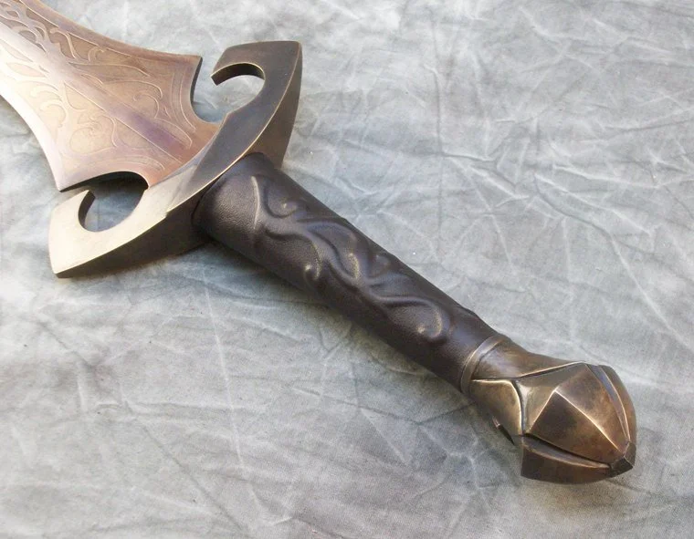 This short leaf blade sword is forged from 80CrV2 steel which was hardened, tempered, sharpened, etched, and heat colored. The hilt components are sculptural quality silicon bronze. The pommel is keyed and hot peened to the tang. The grip is a wood core with leather covering.