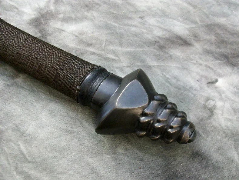 This Sword is based on a sword from a book. The blade is hardened and double tempered 80CrV2 steel. The guard and pommel are sculptural quality silicon bronze. The pommel is hot peened to the tang and the guard is banzaipeened to the shoulder. The grip has a wood core with leather covering and half wire wrap.