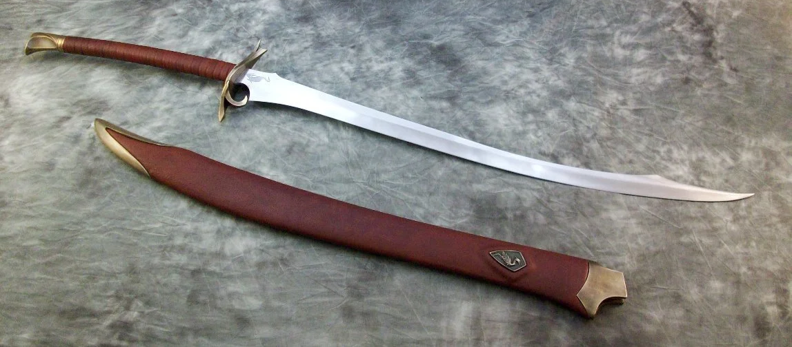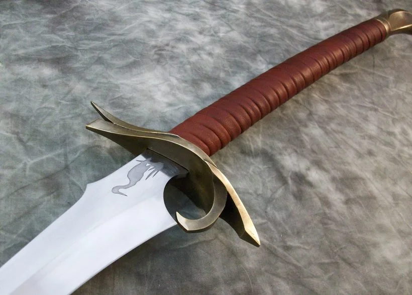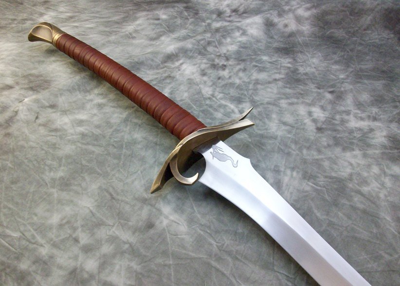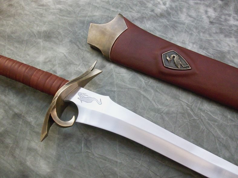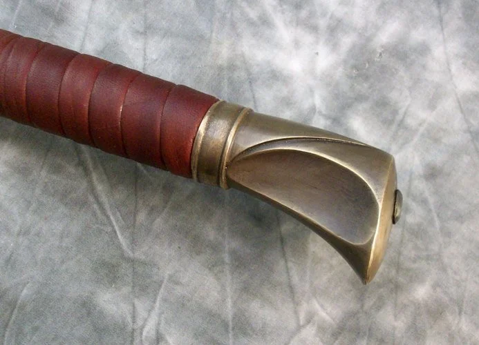 This large heron marked sword has a hardened and tempered blade made from 80CrV2 steel. The hilt and scabbard components are sculptural quality silicon bronze. The pommel is keyed and hot peened to the tang. The guard is banzaipeened to the tang. The grip and scabbard are leather over a wood core.