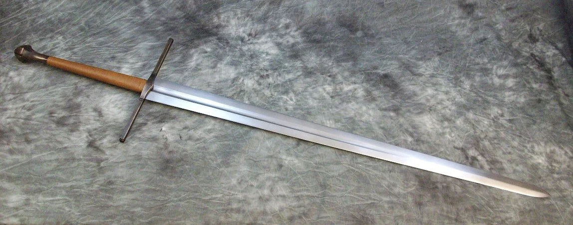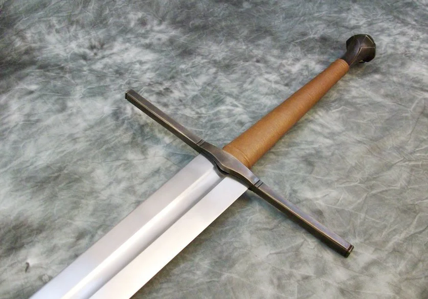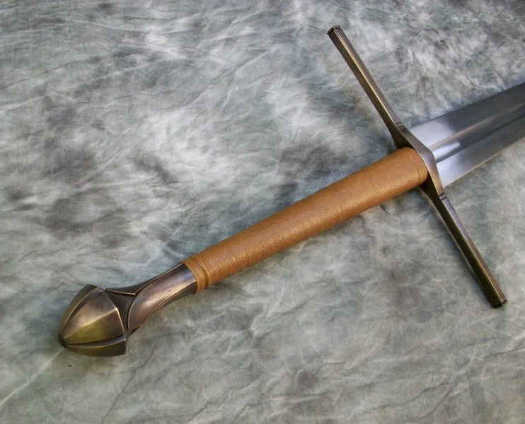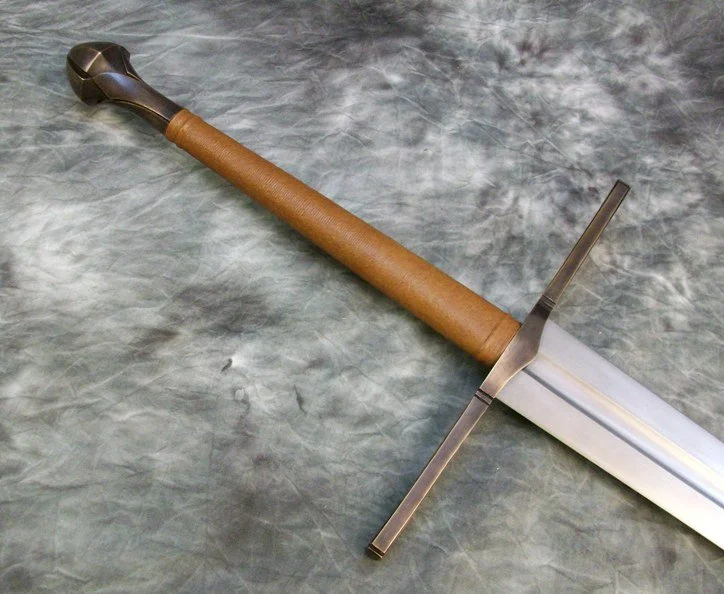 This sword has a sculptural quality bronze guard and pommel. The guard is banzaipeened to the tang and the pommel is hot peened. The grip has a wood core with cotton cord wrap and leather over-wrap. The forged blade is hardened and double tempered 80CrV2 steel.