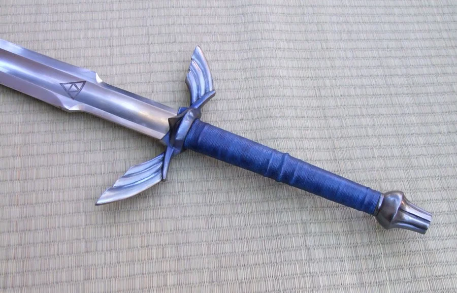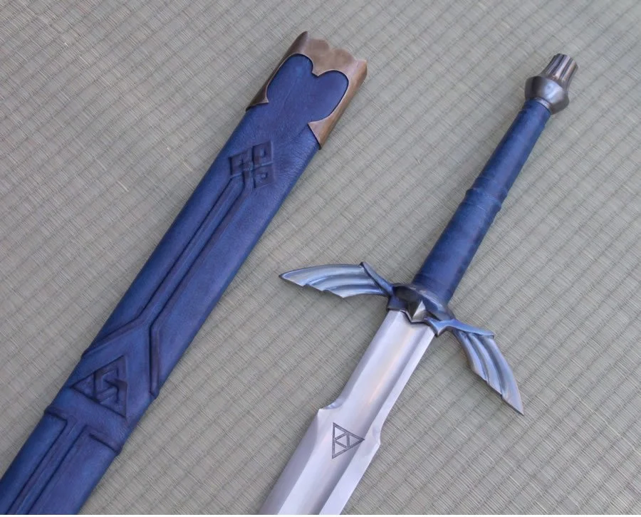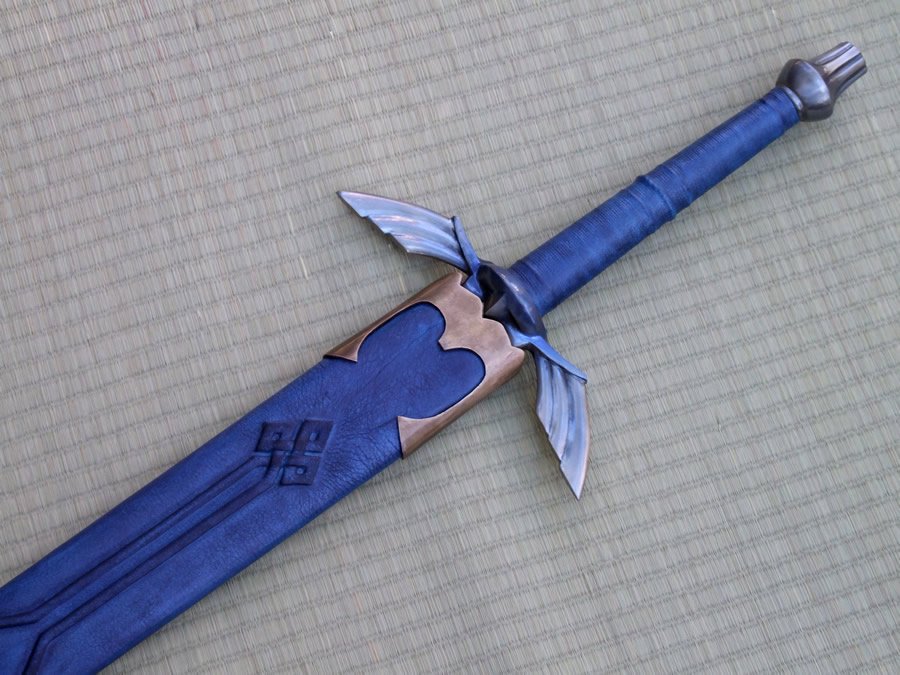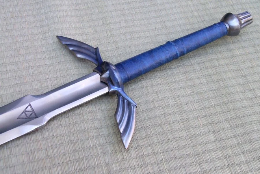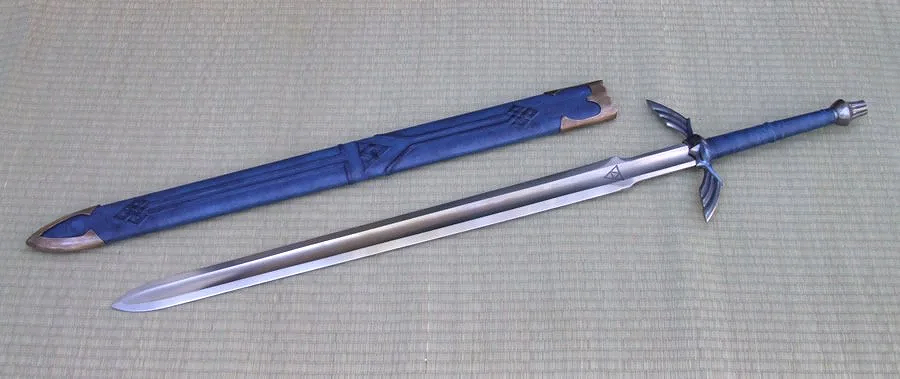 This is my version of what the Hyrule sword from the Legend of Zelda game would look like as a real sword. The blade is hardened, tempered, and sharpened high carbon 80CrV2 steel. The guard and pommel are bronze tinted with blue metal dye. The pommel is hot peened to the tang. The grip has a wood core with cotton cord wrap and leather overwrap.