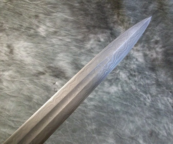 This one of a kind sword is not available but something along similar lines could be commissioned. The cost for a similarly pattern welded sword with scabbard and suspension system would be approximately $6600. The sword by itself without scabbard or belt would be approximately $4900.