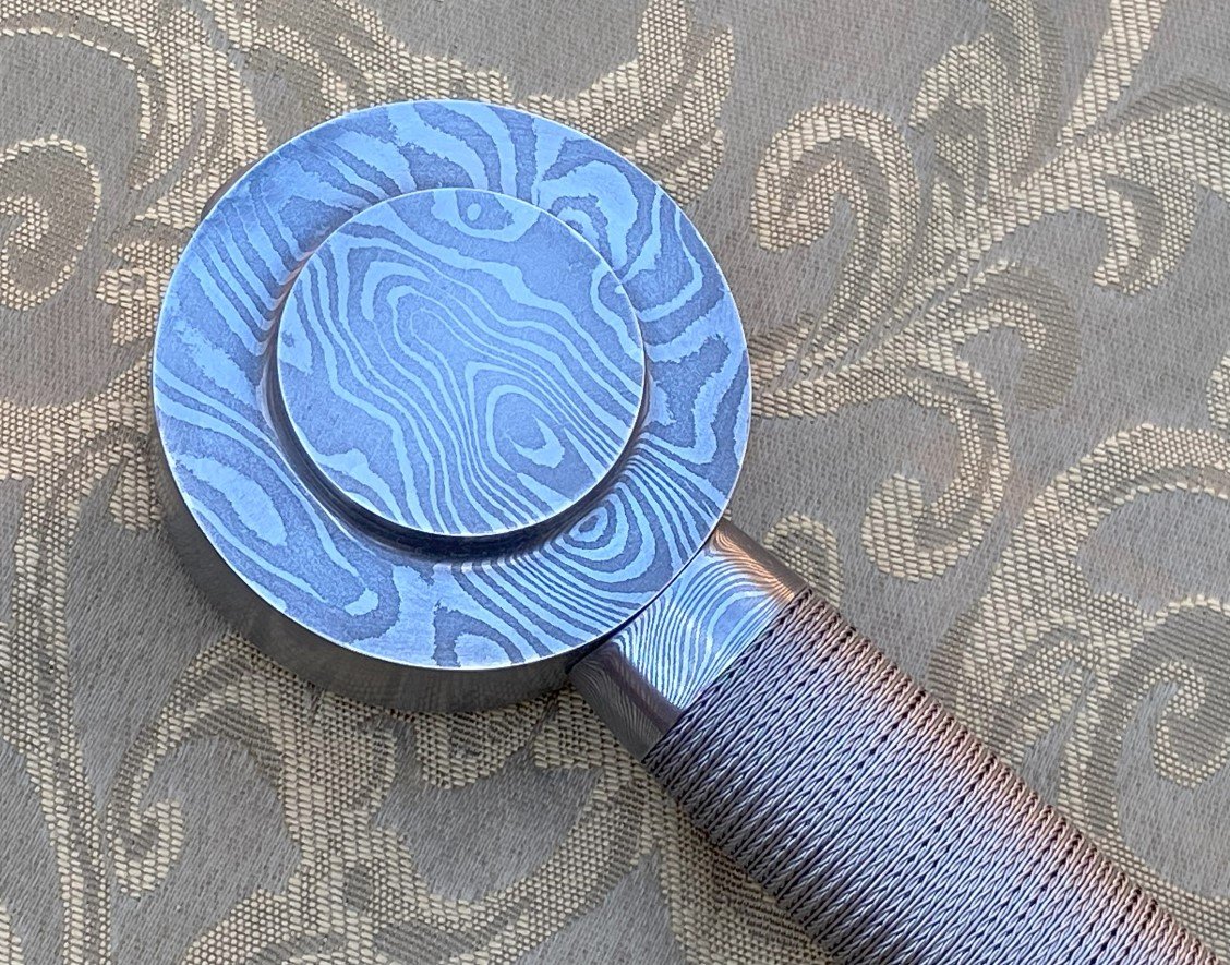 This version of Excalibur is made of pattern welded steel infused with approximately $1000 (which is just a handful) of Gibeon meteorite. The guard, pommel, and two grip rings are made from the same pattern welded/meteor steel. The grip scales are stabilized ebony and the wire wrap is stainless and titanium. All the steel, the meteorite, the wire, the wood, and the hammers used in forging this piece were blessed by the Vatican in Rome (not even kidding).