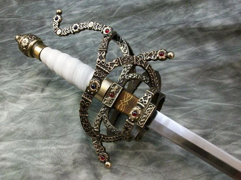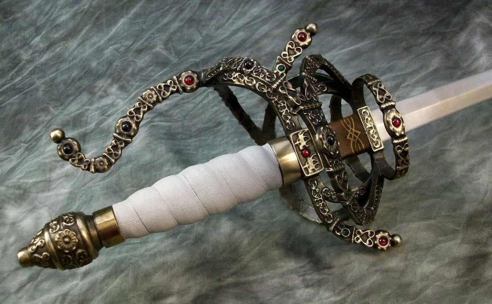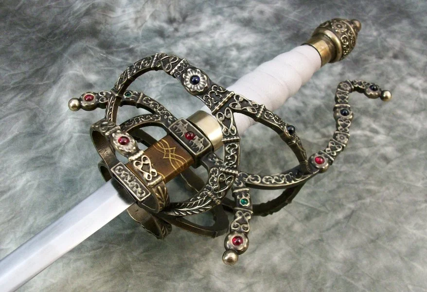 This Sword is based on the sword from the movie "The Princess Bride". The blade is hardened and double tempered 80CrV2 steel. The guard and pommel are sculptural quality silicon bronze. The pommel is hot peened to the tang, and the guard is banzaipeened to the shoulder. The grip has a wood core with a spiral leather wrap. The stones in the guard are lab grown rubies, emeralds, and sapphires.