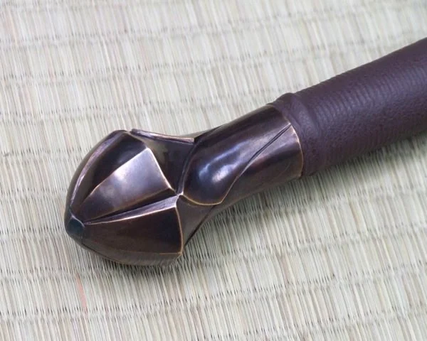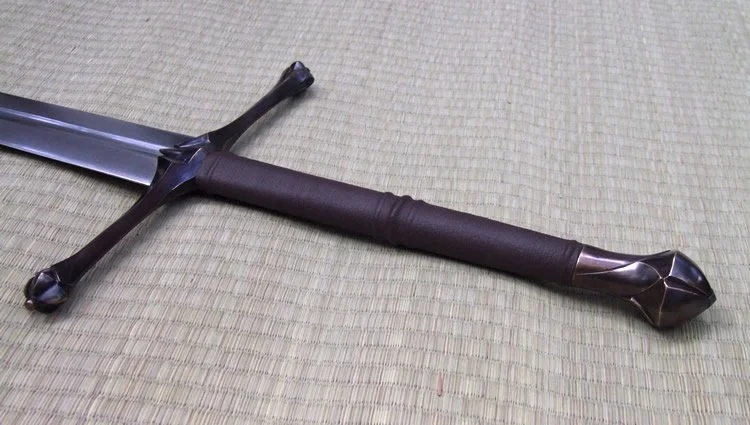 The guard and pommel are sculptural quality silicon bronze. The pommel is keyed and hot peened to the tang. The grip has a wood core with a linen cord wrap and cotton cord risers with a leather covering.