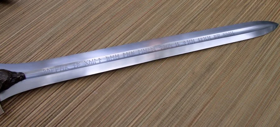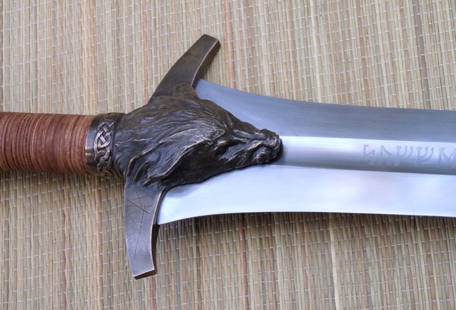 The concept for this sword is a wolf themed Conan sword. The blade is etched inside the wide fuller with runes reading "Suffer no guilt yee who wield this in the name of Odin."
