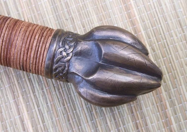 The pommel and guard are bronze. The pommel is hot peened to the tang and both the pommel and guard are banzaipeened to the tang as well. The wood grip is wrapped with spiral leather cord. The blade is hardened and tempered 1075 high carbon steel.