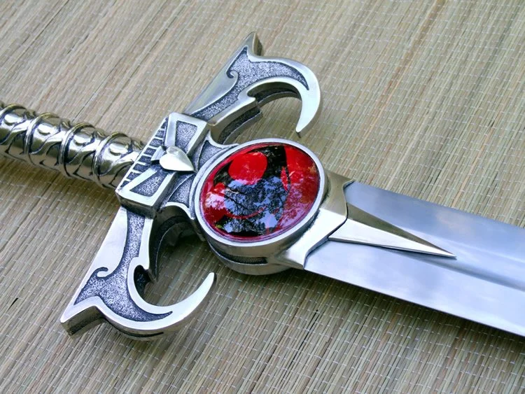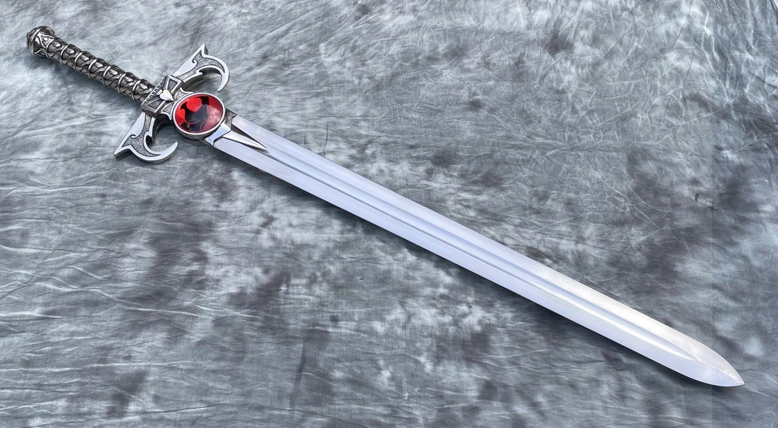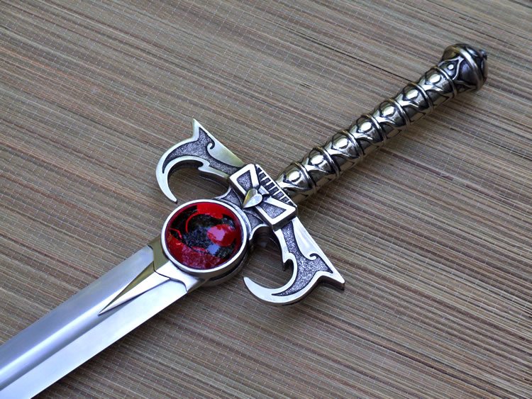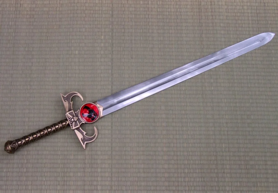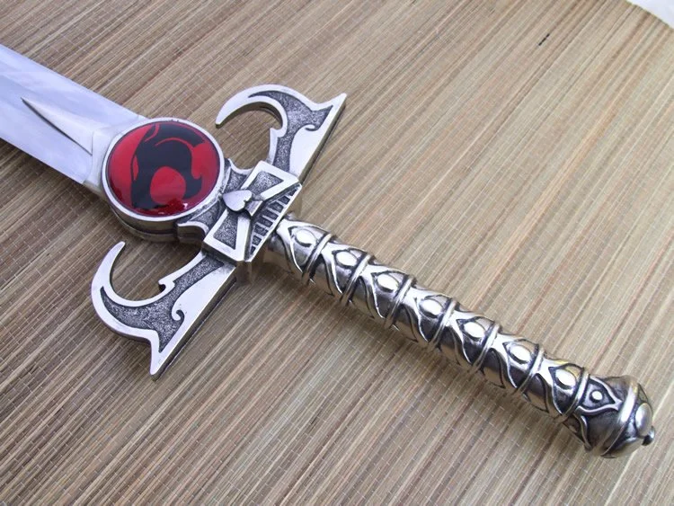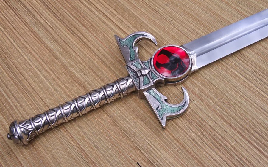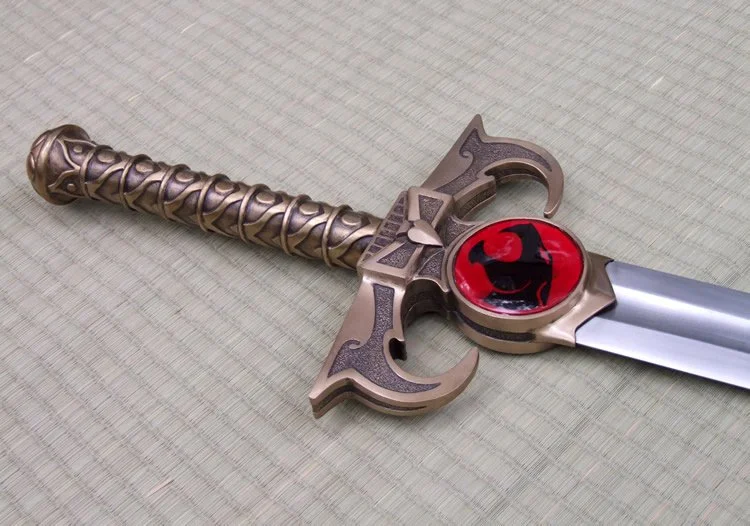 This custom made sword is based on the Sword of Omens from the animated series "Thundercats". The blade is hardened and tempered 80CrV2 high carbon steel. The hilt is bronze with a nickel plating. There is a wood core in the grip between the bronze and the steel tang of the blade. The tang extends through the back of the pommel and is hot peened with a stainless peen block. The cat inserts are acrylic resin.