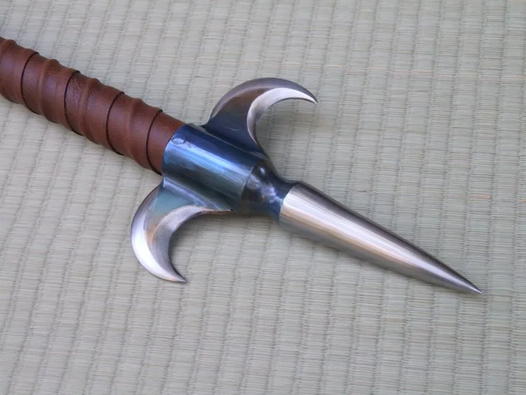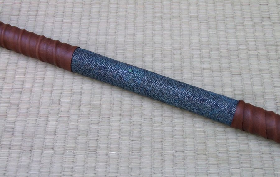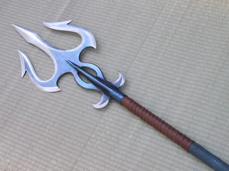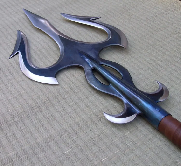 This trident has a 1075 high carbon steel head which is hardened and tempered. The tail spike is hardened and tempered O1 steel. The shaft is a hollow steel rod with 1/8 inch wall thickness. The shaft is wrapped with leather with a cotton cord riser. The center section of the shaft has a dyed ray skin insert.