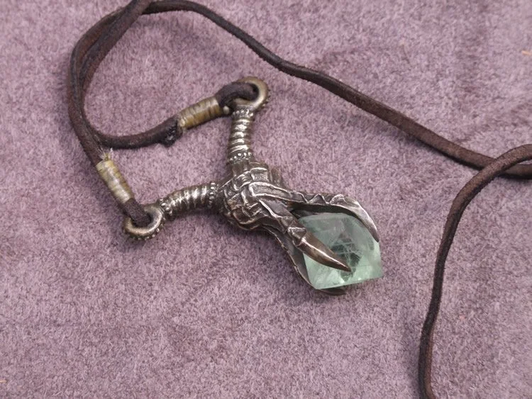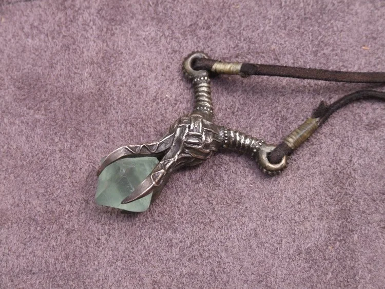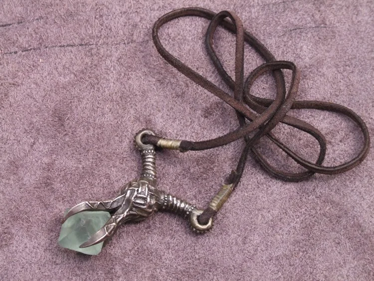 Companion piece to the Dragonslayer spear. The amulet is bronze with a leather cord and fluorite octahedron stone.
