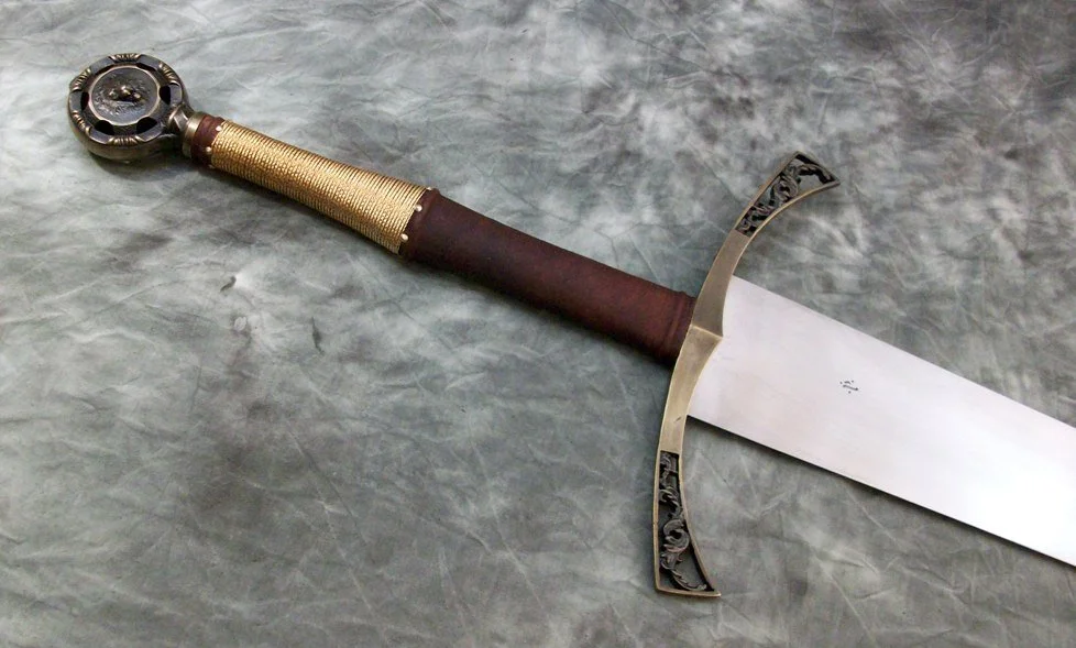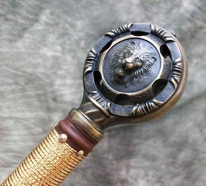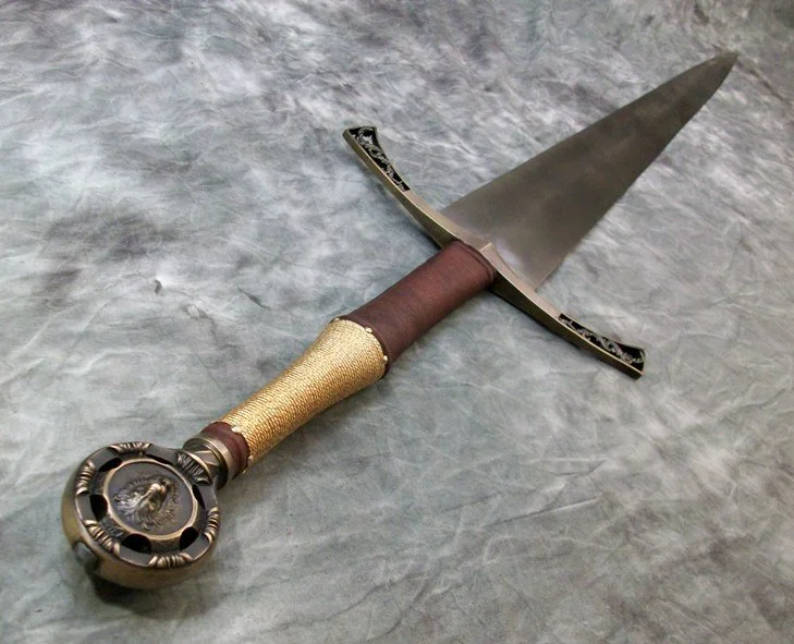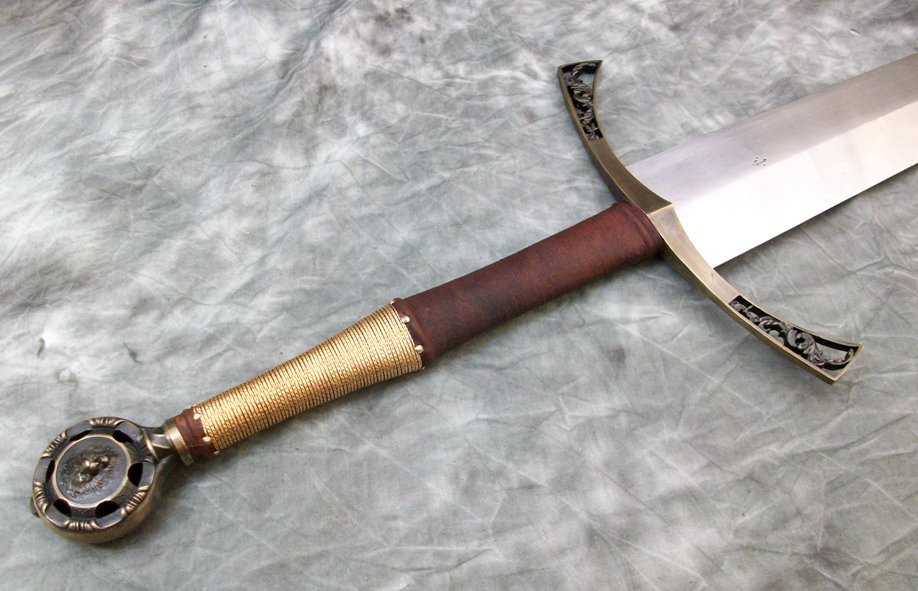 This Sword is a custom hilt on a finished Albion bare blade. The tang was extended but nothing else was done to the blade. The guard and pommel are sculptural quality silicon bronze. The pommel is keyed and hot peened to the tang. The guard is banzaipeened to the tang. The leather covered wood grip has a half wire wrap done with twisted brass wire.