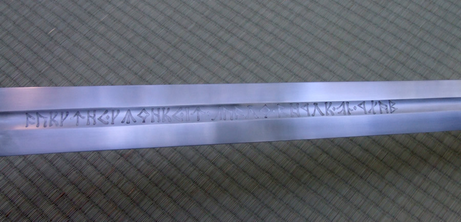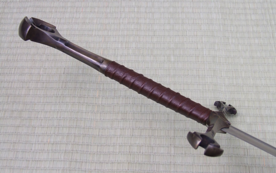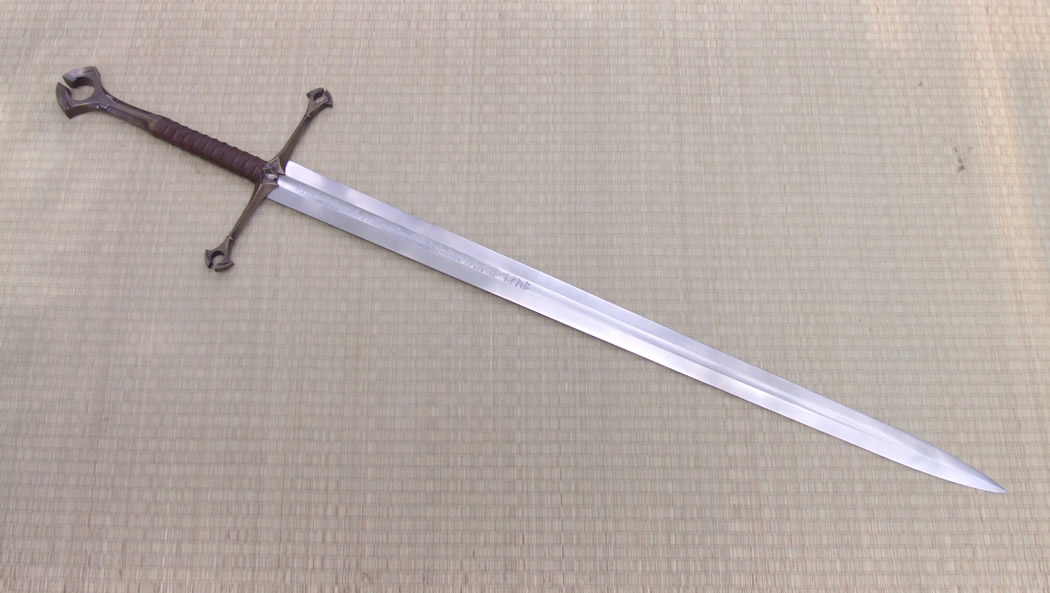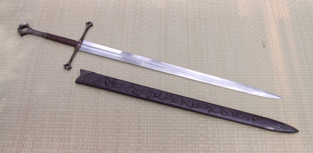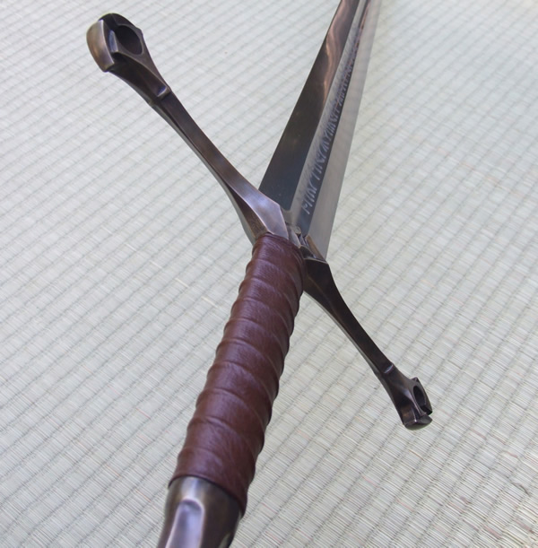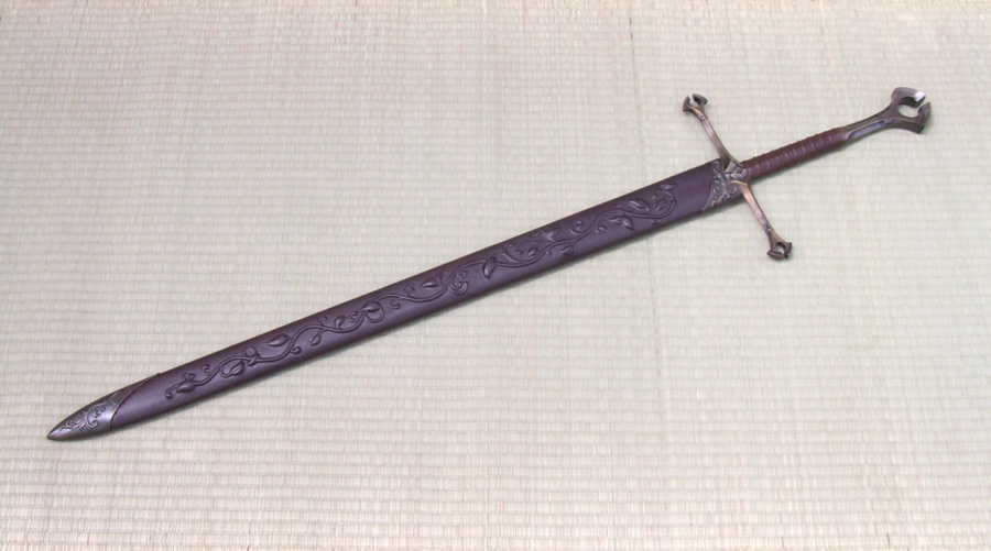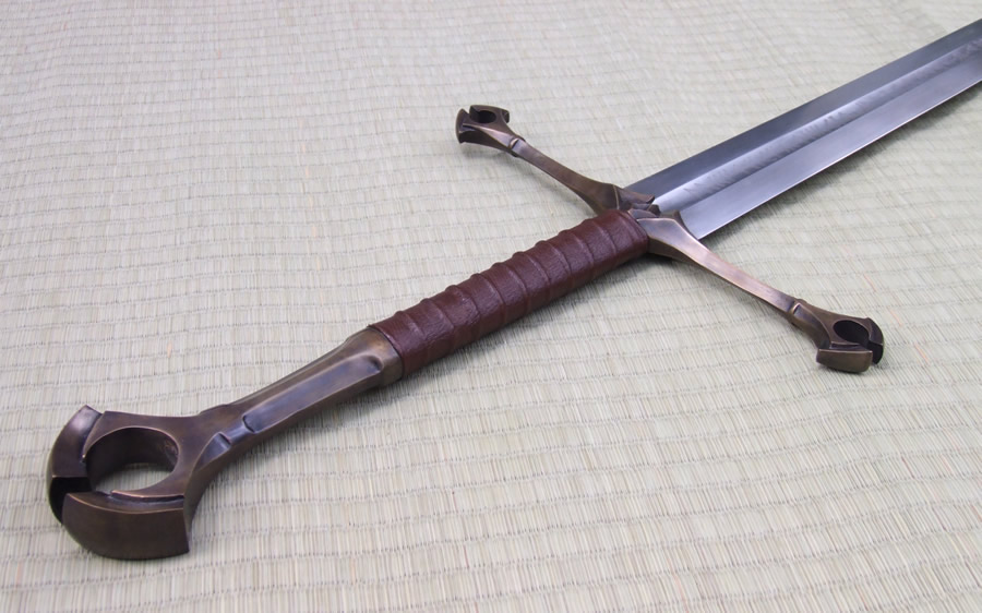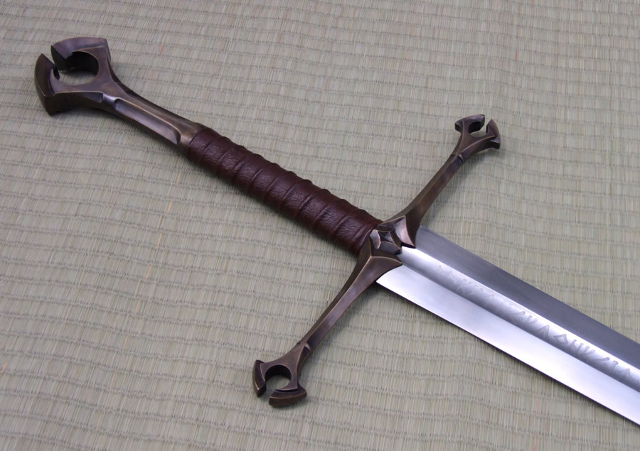 This Sword is loosely based on the Anduril movie sword. The blade is hardned and tempered 1075 high carbon steel with a sharpened edge. The guard and pommel are sculptural quaity silicon bronze. The tang extends all the way through the keyed slot in the pommel and is hot peened. The grip is a wood core with a linen cord wrap, a cotton cord riser, and a leather overwrap.