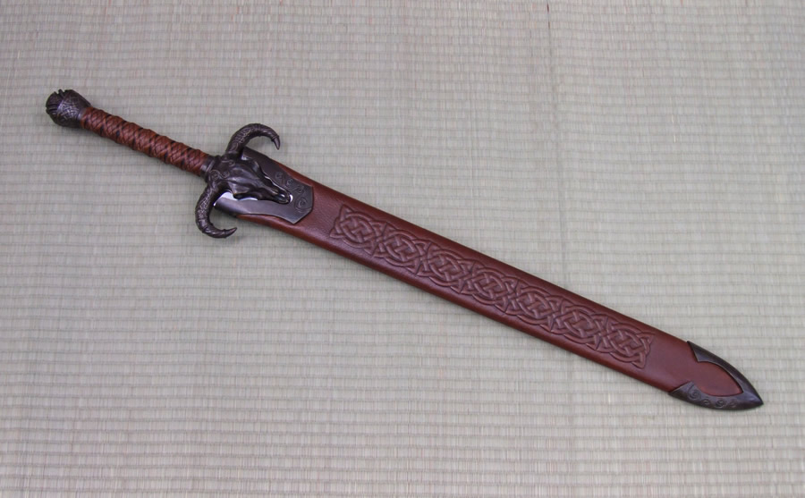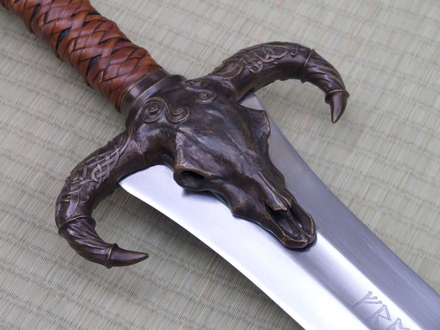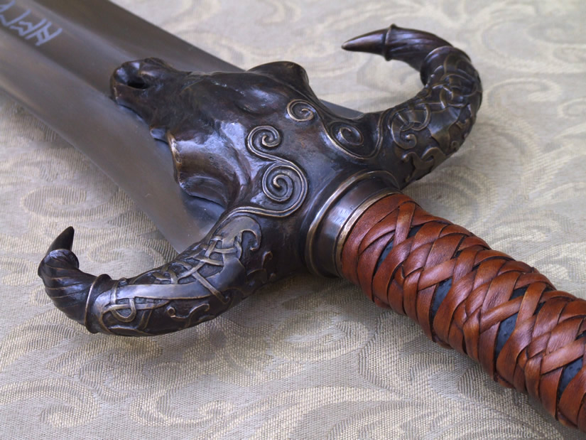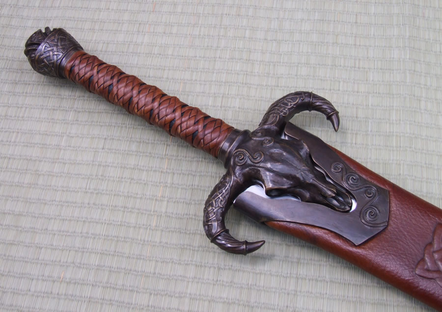 The concept for this sword was to have a piece with a similar feel to the 1982 Conan movie sword but still be an original design. The guard is the skull of an aurochs. I chose this for a few reasons. The aurochs was one of the few animals which had forward pointing horns, unlike the Irish Elk skull from the movie sword, which actually has its antlers on backwards to facilitate use as a sword guard. Representations of aurochs can be found as far back as prehistoric cave paintings and they died out in the early 1600's. Bulls have been considered sacred or worshiped as symbols of power and verility for long streatches of human history. For these reasons I felt an aurochs could be an important icon for an early human society.