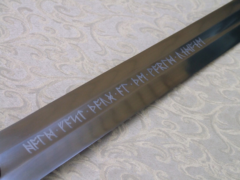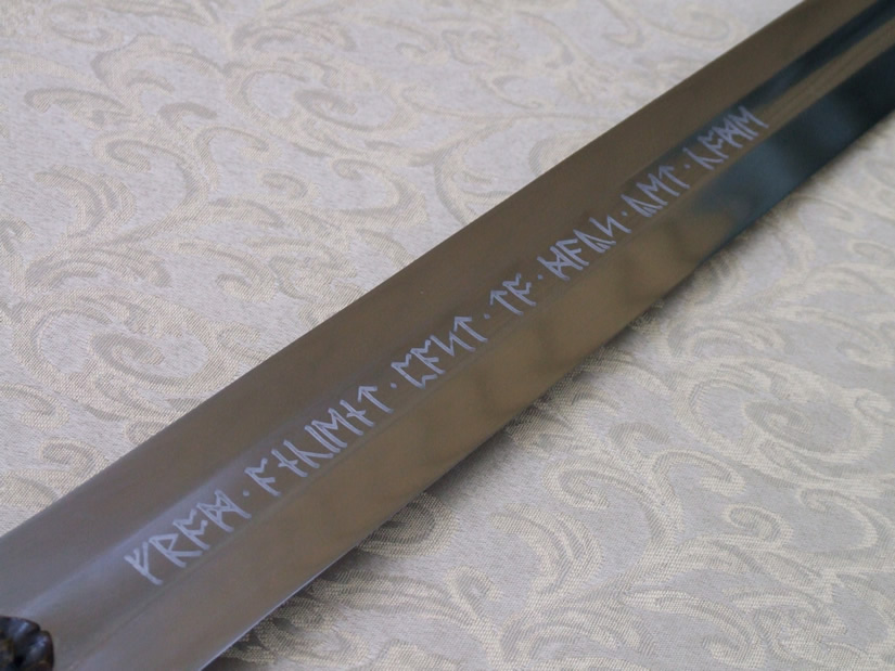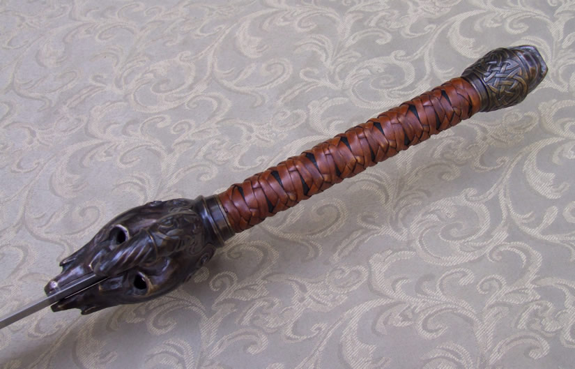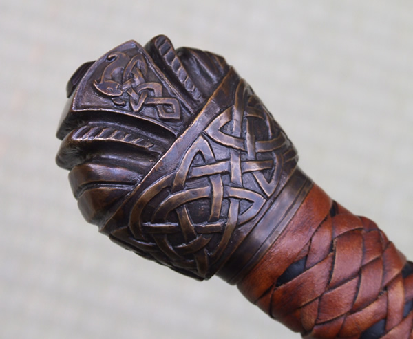 The pommel has an interlace design on the body to evoke a Norse feel. The top of the pommel is based on a Scandinavian type "s" pommel cap and contains an image of a serpent with its tail in its mouth as Ouroboros or Jormungandr.