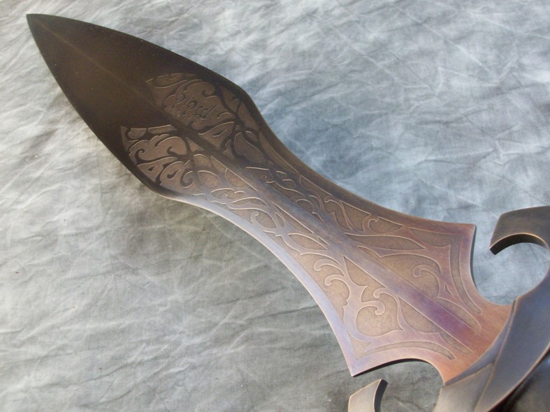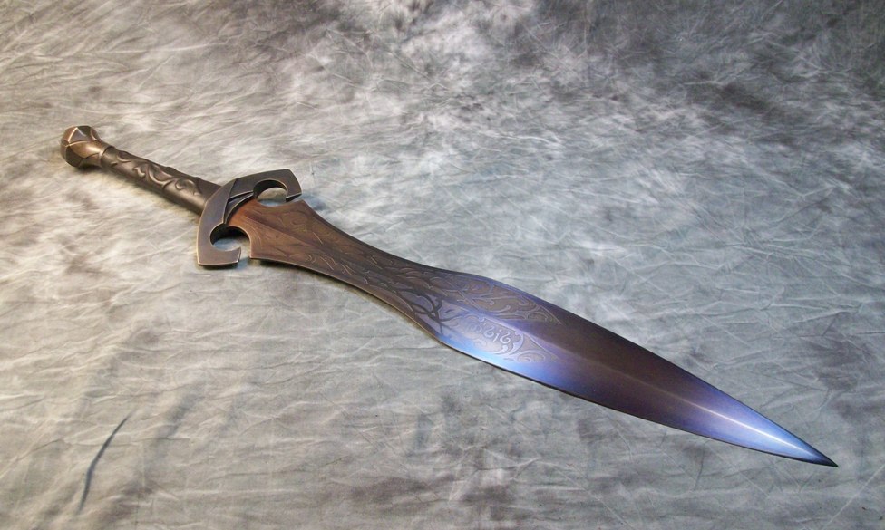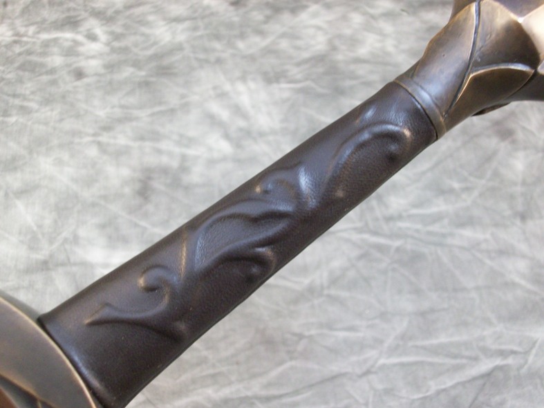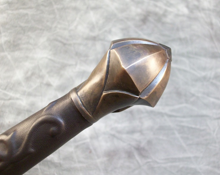 This short leaf blade sword is forged from 80CrV2 steel which was hardened, tempered, sharpened, etched, and heat colored. The hilt components are sculptural quality silicon bronze. The pommel is keyed and hot peened to the tang. The grip is a wood core with leather covering.