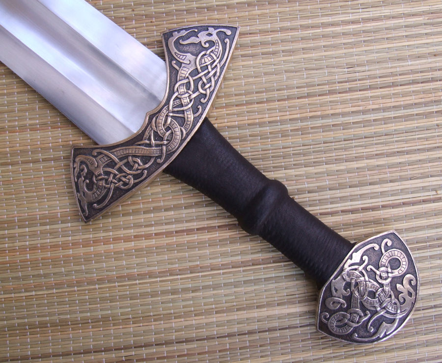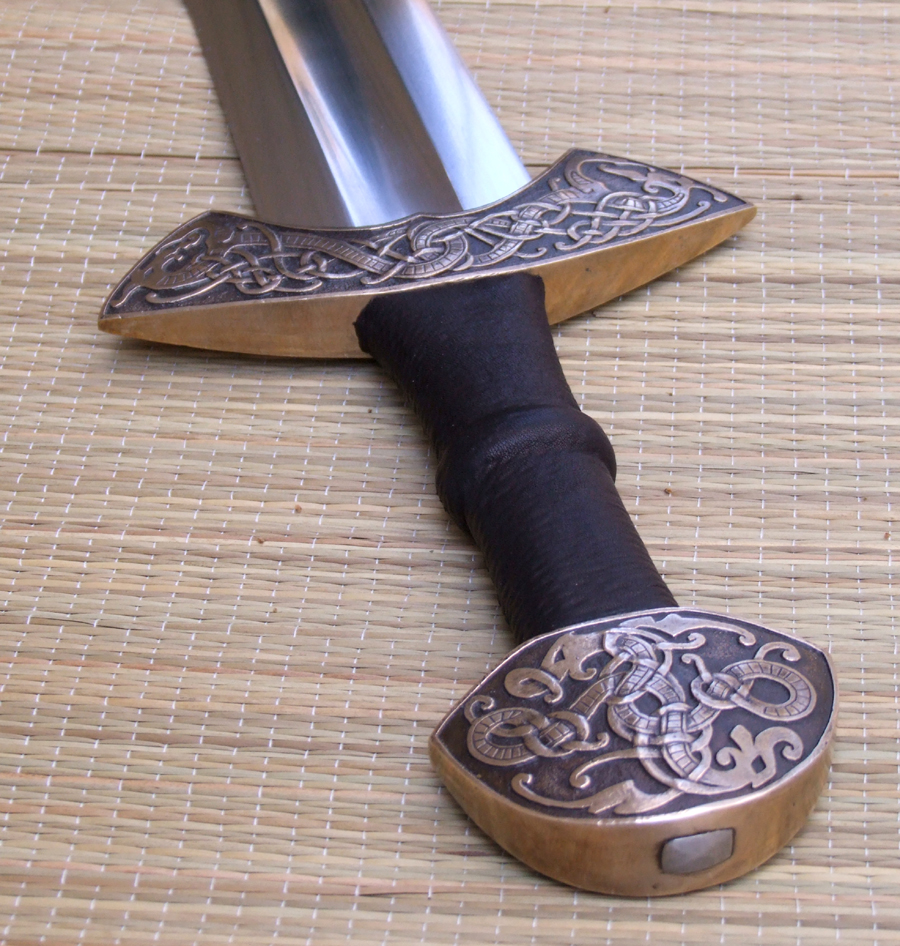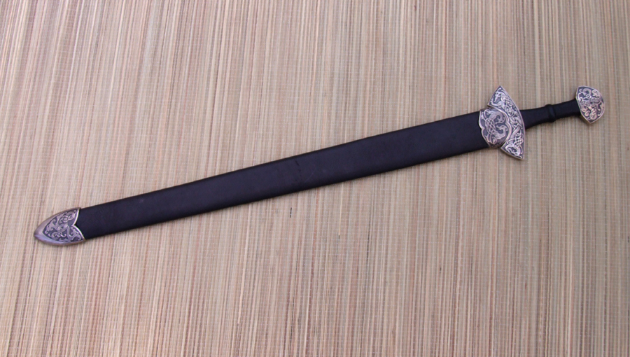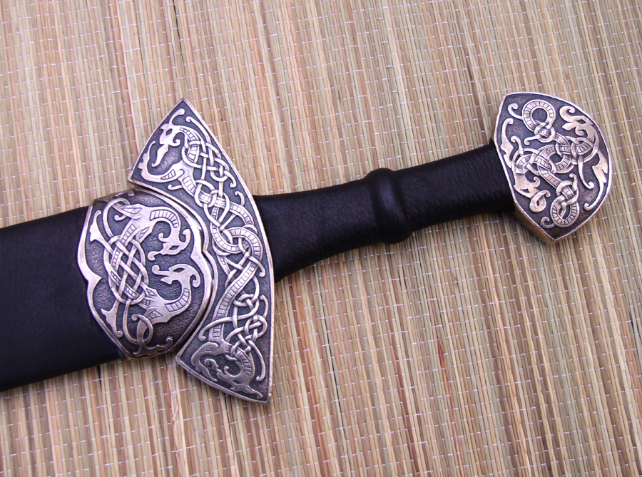The cross and pommel are bronze with zoomorphic animal designs. The guard is peened to the tang and the pommel is keyed and hot peened. The grip is leather over a wood core. Prototype scabbard is leather over a wood core with matching bronze chape and locket.