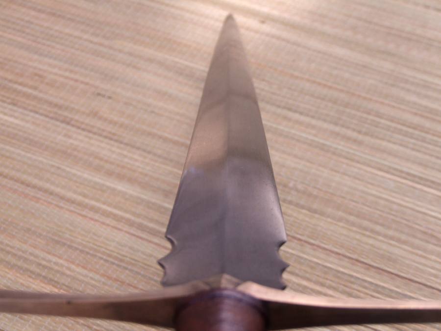 The guard is a slightly shorter version of one of my long sword guards. The guard and pommel are bronze. The uard is banzaipeened to the shoulder of the tang for a secure fit. The pommel is also banzaipeened to the tang on the grip side and is hot peened to the tang on the far sie as normal. The grip is a wood core which is epoxied on and pinned with a bronze pin. The grip has a linen cord underwrap with cotton cord risers covered with a leather wrap.