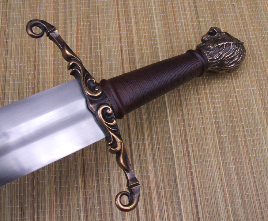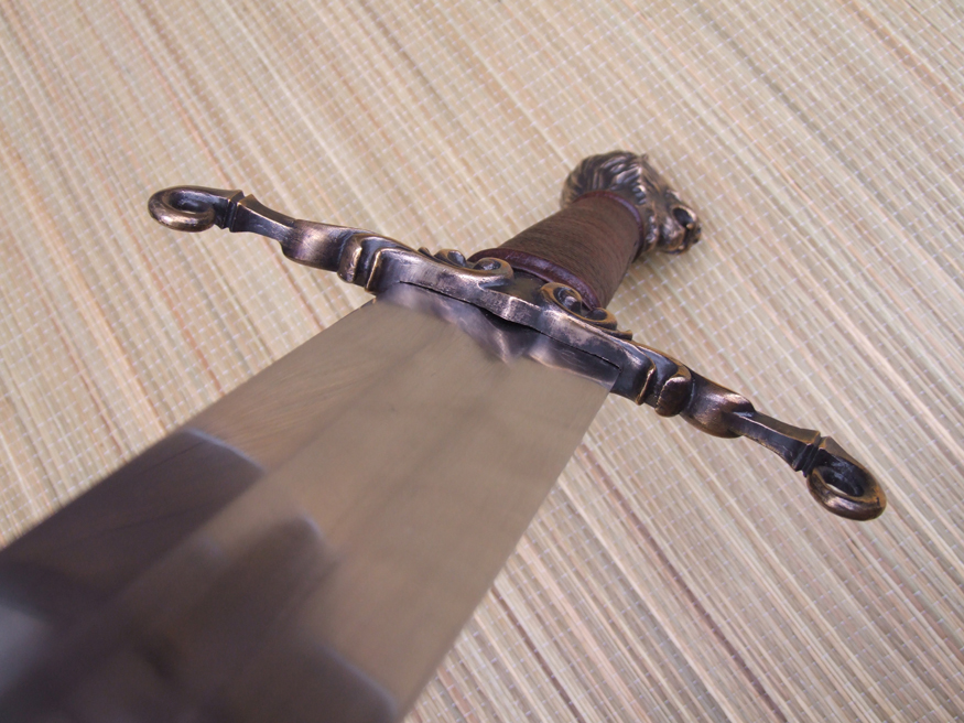 The cross guard is bronze and is peened to the tang. The grip is a wood core with a linen cord wrap and leather cord risers under leather over-wrap. The pommel is bronze and is keyed onto the tang and tig welded.
