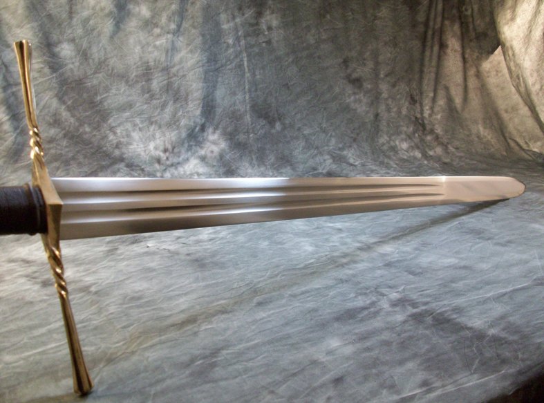 This is a larger sword based on a similar prototype version I made some time ago. The double fullered blade is forged from 80CrV2 steel and is hardened, tempered, and sharpened. The hilt components are sculptural quality silicon bronze which has been polished over an antique patina. The pommel is keyed and hot peened to the tang. The grip has a wood core with cord wrap and leather overwrap.