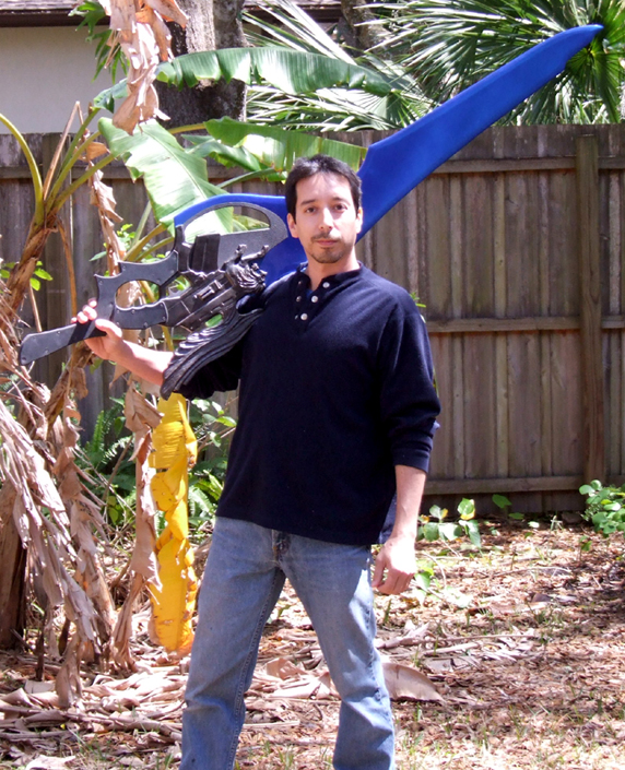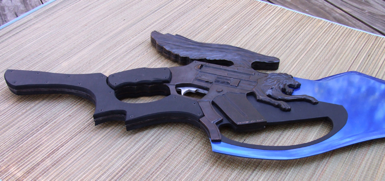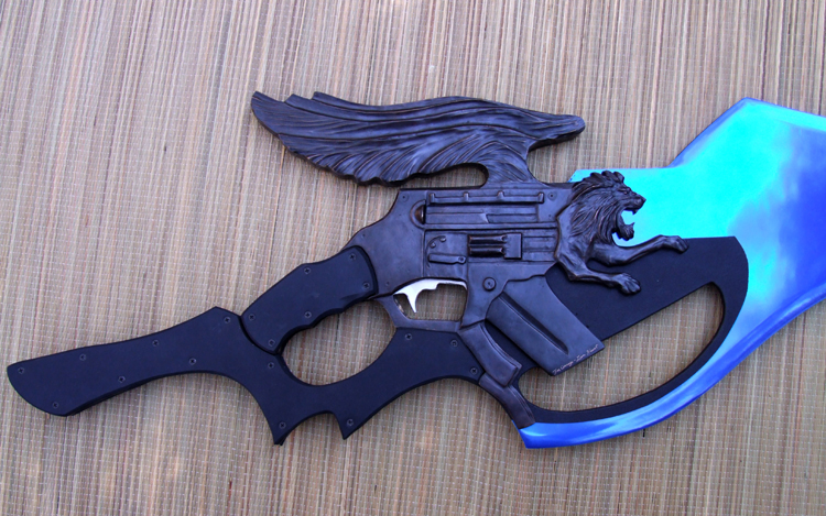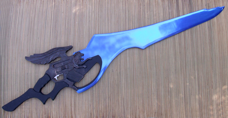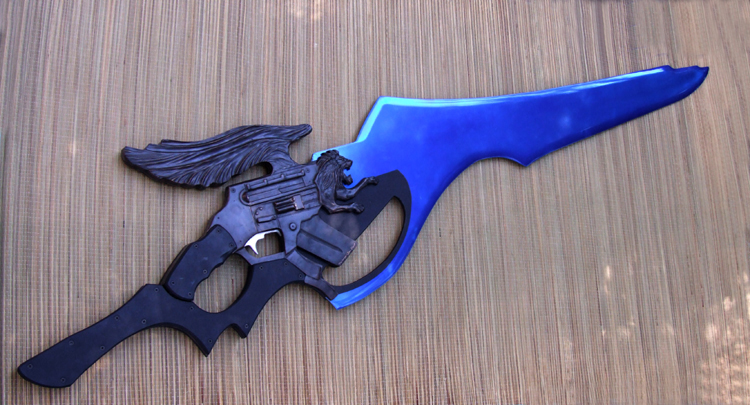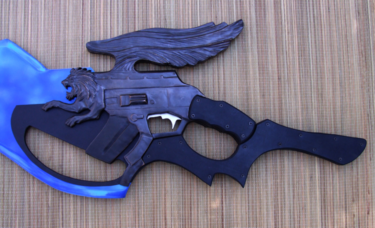 This giant liongun/blade is based on a weapon from a video game. It is completely non-functional and for display only. The blade extends the full length through to the back of the full tang grip and is made of polished aluminum with a transparent blue powdercoat. The liongun portion is bronze while the covering on the grips is rubber. This piece is sold but something similar could be commissioned.