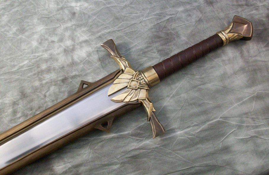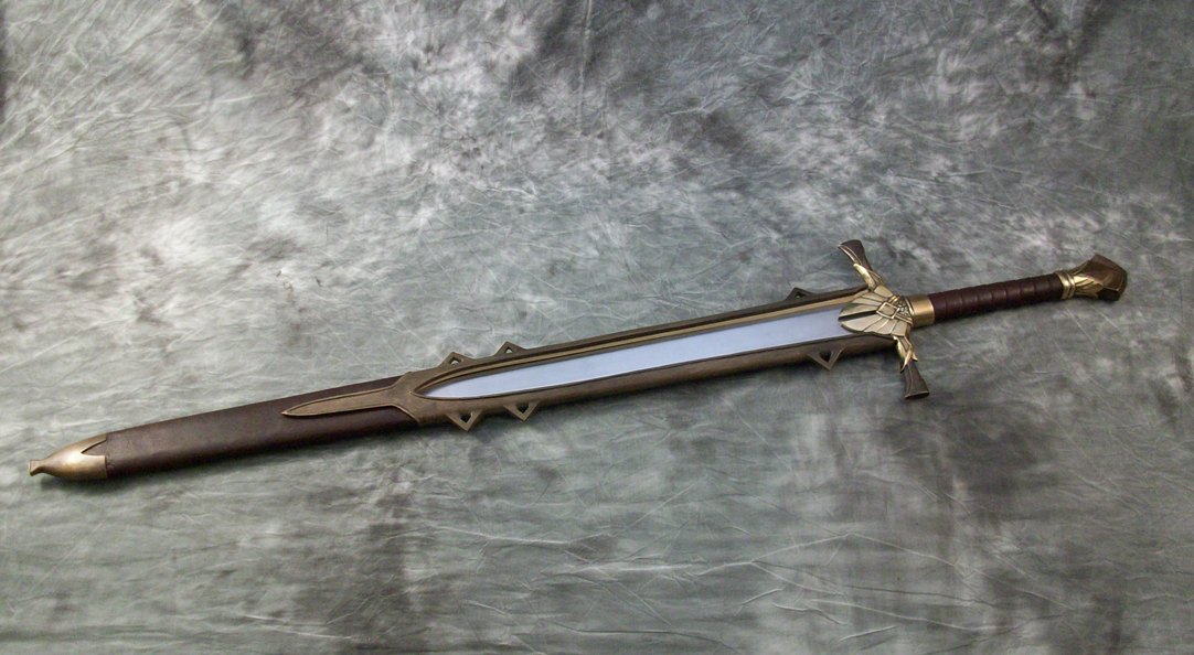 This sword set is based on a pair of swords in a video game. The blades are hardened, tempered, and sharpened 80CrV2 steel. The guards and pommels are sculptural quality silicon bronze. The pommels are keyed and hot peened. The grips have wood cores with cotton wraps and leather overwraps. The scabbards are wood with leather covering and bronze chapes and lockets.