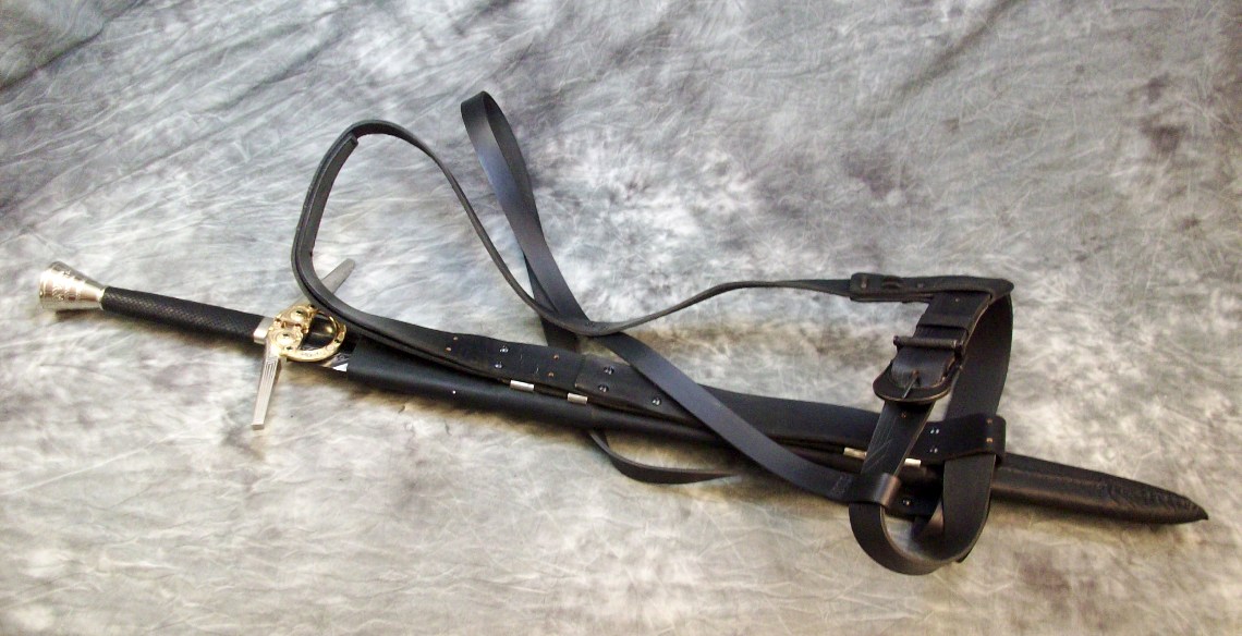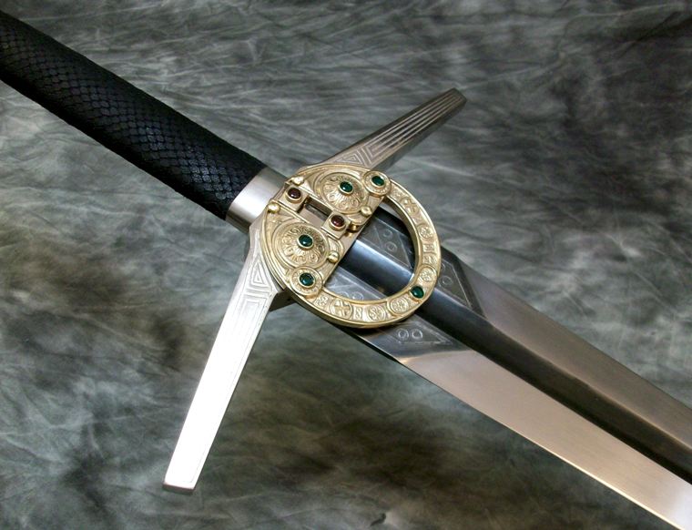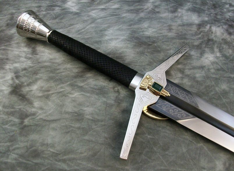 This Sword is based on the steel sword from the Witcher TV series. The blade is hardened and tempered 80 CrV2 steel. The guard is nickel plated steel. The pommel is nickel plated bronze. The brooch pieces on the guard are gold plated bronze with gemstones. The scabbard is a wood core with leather covering.