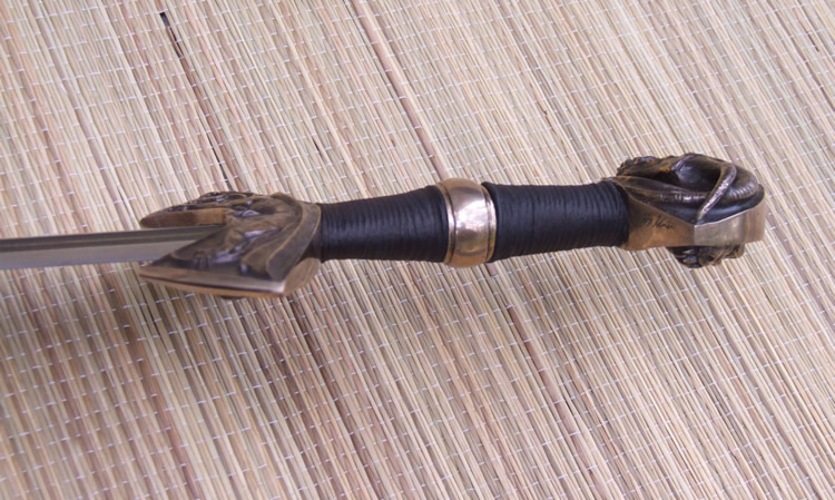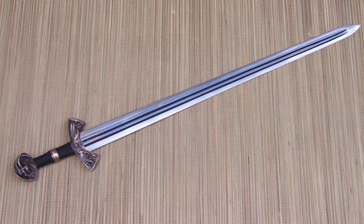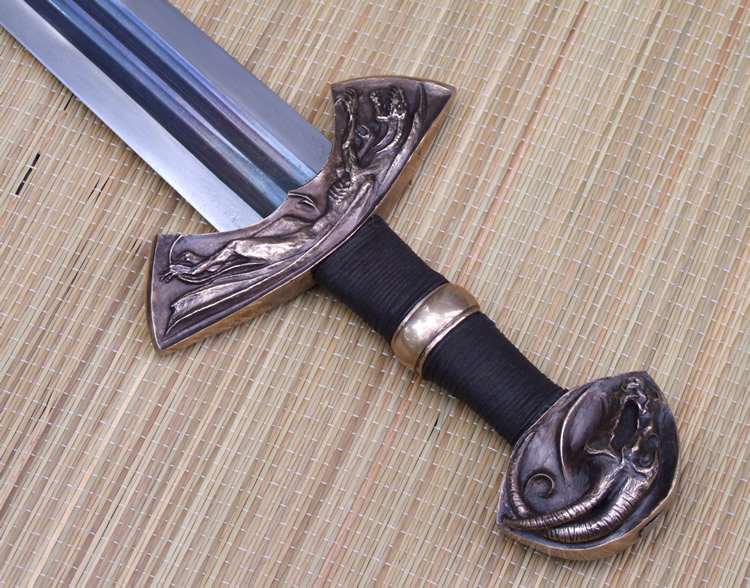 This fantasy viking sword is made with a blade from the Albion Moat sale. The blade came as an unhardened rusty blank. The blade is now hardened, tempered, finish ground, and sharpened. The pommel, guard, and grip ring are bronze. The cross is backpeened to the tang and the pommel is hot peened as well as back peened. The grip is wood with a leather wrap. The fullers on the blade are heat blued. The sword has a very distinctive ring which is why I've chosen to name it Wyrmsweg.